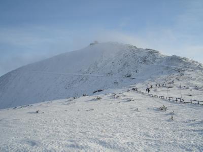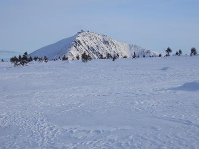 Wir entschlossen uns abzukürzen und zwar auf direkten Weg zur Schneekoppe. Ein paar Fußspuren sagten uns, daß wir nicht die ersten mit dieser Idee waren. Nach kurzer Zeit merkten wir aber, das der Weg wohl doch nicht so gut war, weil wir bei jedem Schritt ziemlich tief im Schnee versanken. Das Gehen wurde immer schwieriger. Aber jetzt wollten wir nicht mehr zurück. Das Ziel im Auge gelangten wir irgendwann wieder zurück auf den Schustlerova(Schusterweg), wo mittlerweile viel Betrieb war.