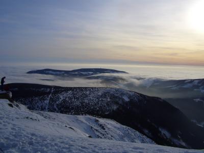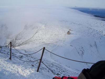 Da zwei von uns keine Seilbahn fahren (ich inbegriffen) haben wir uns in unserem Winterurlaub im Dezember 2007 zu Fuß auf den Weg gemacht. Sechs vollkommen untrainierte Couch-Potatoes auf dem Weg nach oben. Das Wetter war optimal - Sonne und kaum Wind. Um uns ein wenig zu schonen, haben wir uns erstmal mit einer Mini-Pistenraupe zur Výrovka-Bouda fahren lassen. (Der Fahrer sagte, von da aus wäre es noch eine Stunde Fußweg. Na, schauen wir mal.) Dort angekommen, waren wir überwältigt von der Aussicht über den Wolken.
